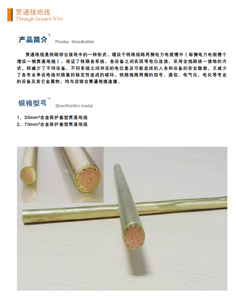 貫通地線是鐵路綜合接地中的一種形式,埋設于鐵路線路兩側(cè)電力電纜槽中(每側(cè)電力電纜槽個埋設一根貫通地線),保證了鐵路各系統(tǒng)、各設備之間實現(xiàn)等電位連接,采用全線路統(tǒng)一接地的方式,即減少了不同設備、不同系統(tǒng)之間存在的電位差及可能造成的人身和設備的安全隱患,又減少了各專業(yè)單設地線對路基的穩(wěn)定性造成的破壞,鐵路線路兩側(cè)的信號、通信、電氣化、電化等專業(yè)的設備及其它金屬物,均與該綜合貫通地線連接。